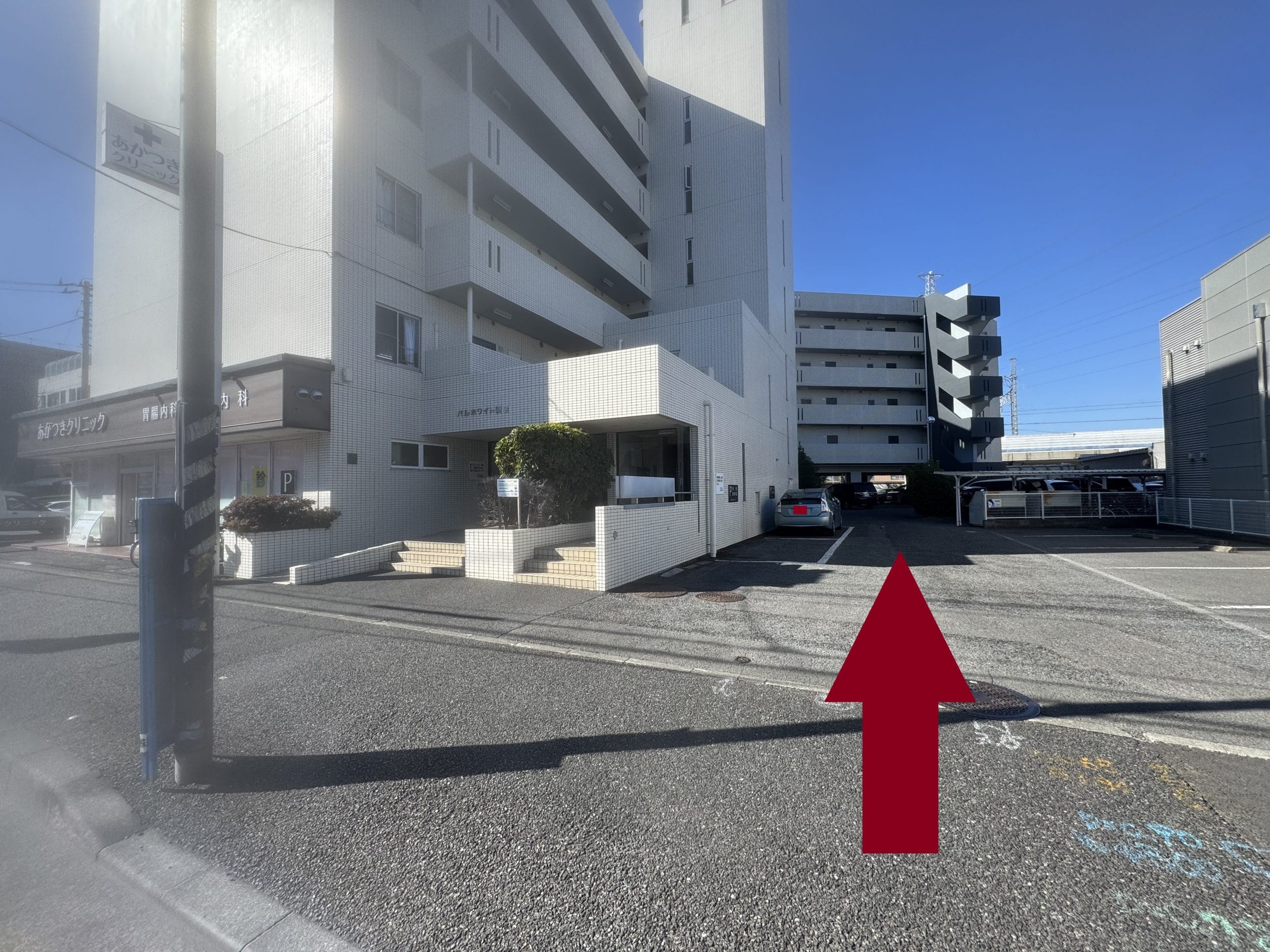 ①あかつきクリニックとアウディの間にある駐車場の入り口から入ります。