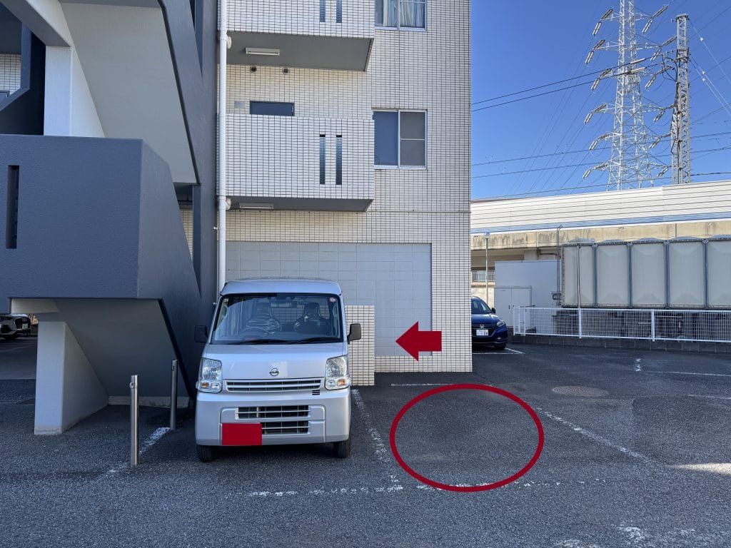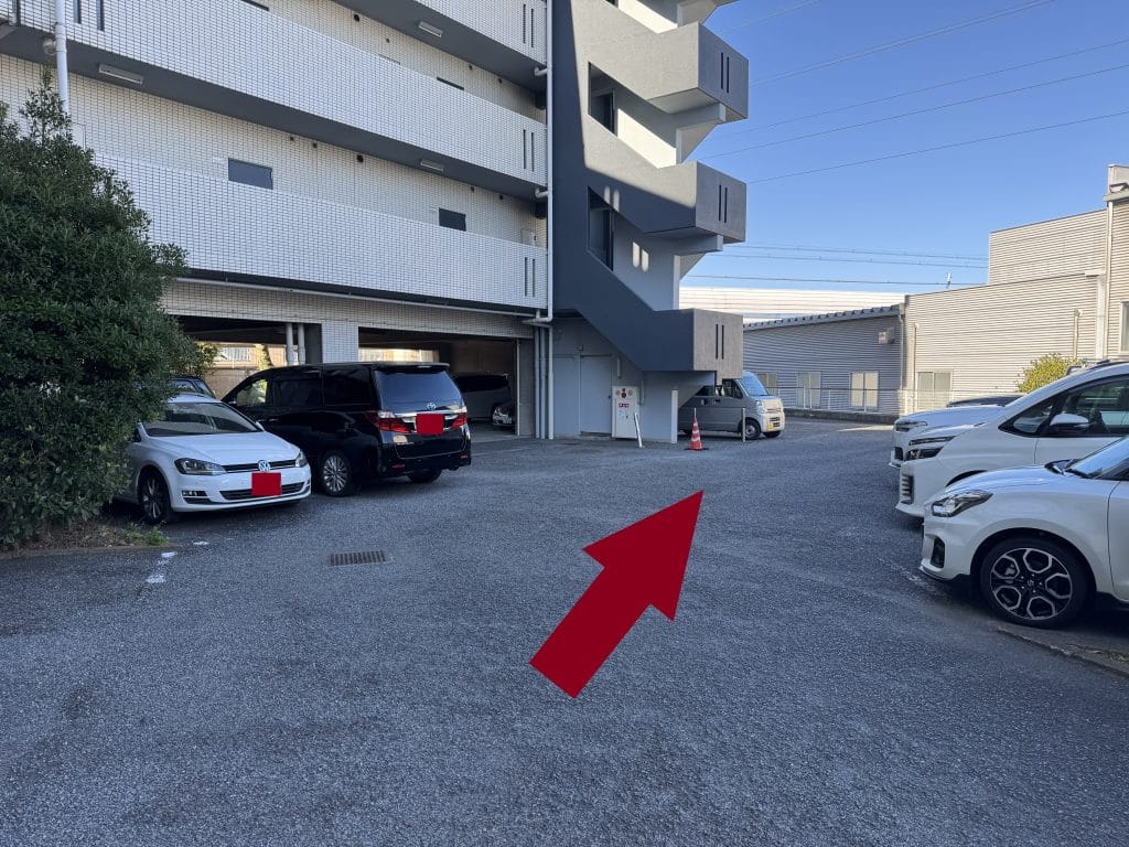 ②駐車場は階段奥にあります。まっすぐ奥まで進んでください。(車長が長い車の場合は切り替えしてバックで進んだほうが駐車しやすいです)
